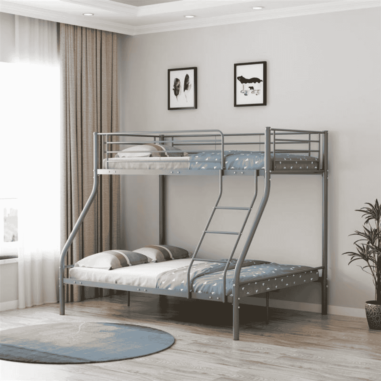 Accommodates 1 single mattress on top and 1 double mattress on the bottom. The Titan Metal Bunk Bed features a durable steel frame, top safety rails, strong metal slats, and a space-saving design. Its modern silver finish and practical layout make it ideal for shared bedrooms, teens’ rooms, guest rooms, and family homes. Accommodates 1 single mattress on top and 1 double mattress on the bottom.