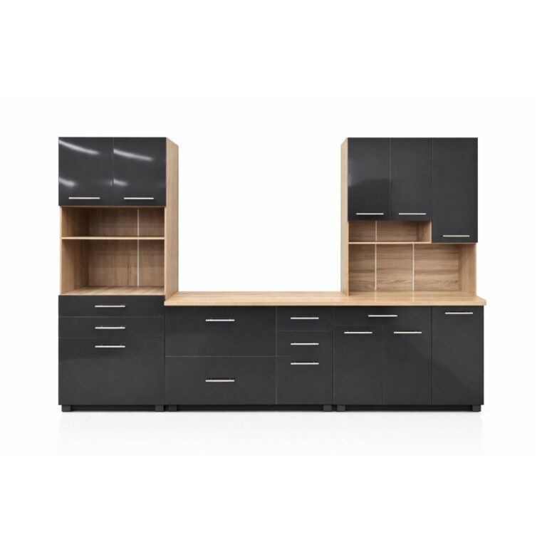 The Kitchen Set – Light Grey + Sonoma Oak features a modern design with warm wood accents, offering spacious cabinets and durable surfaces for everyday use. Crafted from medium density particleboard, it provides organised storage, easy maintenance, and a clean, contemporary look for modern kitchens.