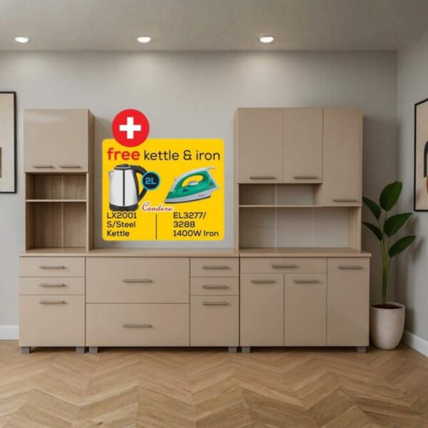 Give your kitchen a bold, modern transformation with the Contempo Classic Kitchen Set – MW971. Featuring a striking high-gloss finish paired with warm oak panels, this unit delivers premium storage, design elegance, and long-lasting durability. Includes FREE 2L Stainless Steel Kettle + 1400W Steam Iron.