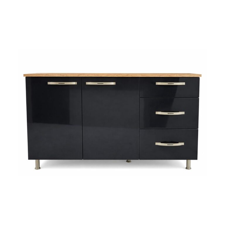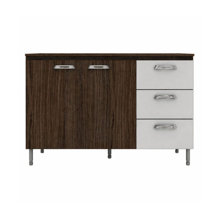 The Kitchen Base – Nogueir features a rich walnut finish with two cupboards and three drawers for organised storage. Built from durable engineered wood with modern black handles, it offers practical, stylish storage for contemporary kitchens.