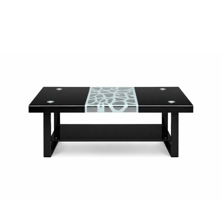 Modern glass coffee table with patterned design, glossy black finish, chrome accents, and lower shelf. Stylish, durable, and ideal for living rooms.