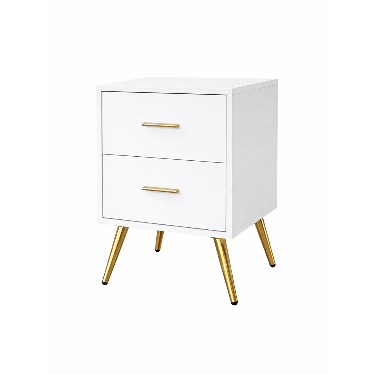 The bright white finish exudes freshness and modern elegance. Paired with shimmering gold legs, it brings a glamorous accent that enhances the overall aesthetic. A spacious drawer provides practical storage for your bedside essentials, helping you keep your space tidy and organized.