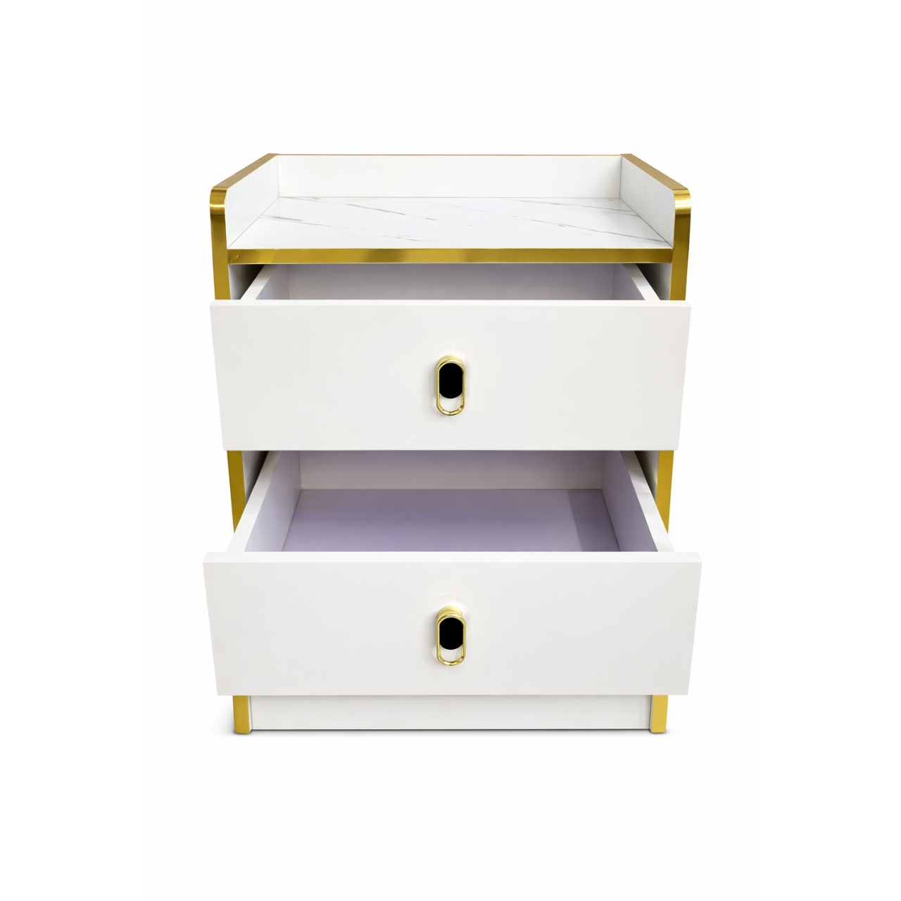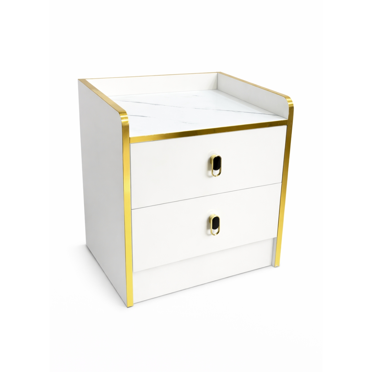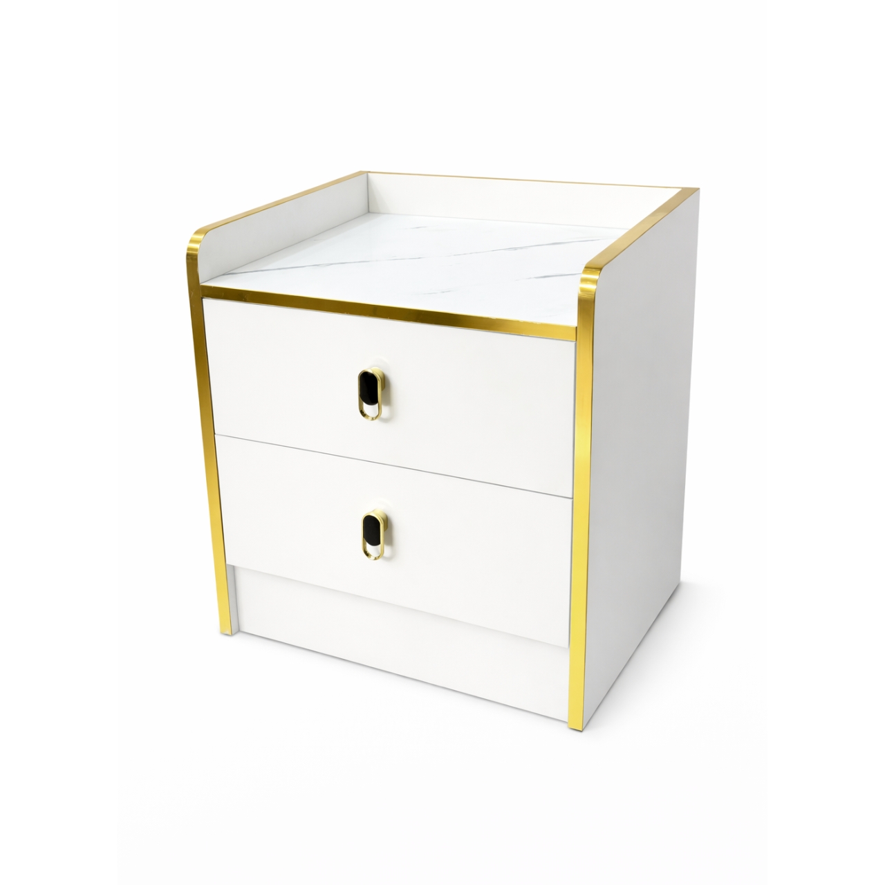 The Modern White Nightstand with Gold Accents features a sleek design with two spacious drawers for organised storage. Finished in white with elegant gold details, it offers a durable and stylish solution for bedrooms or accent spaces.
