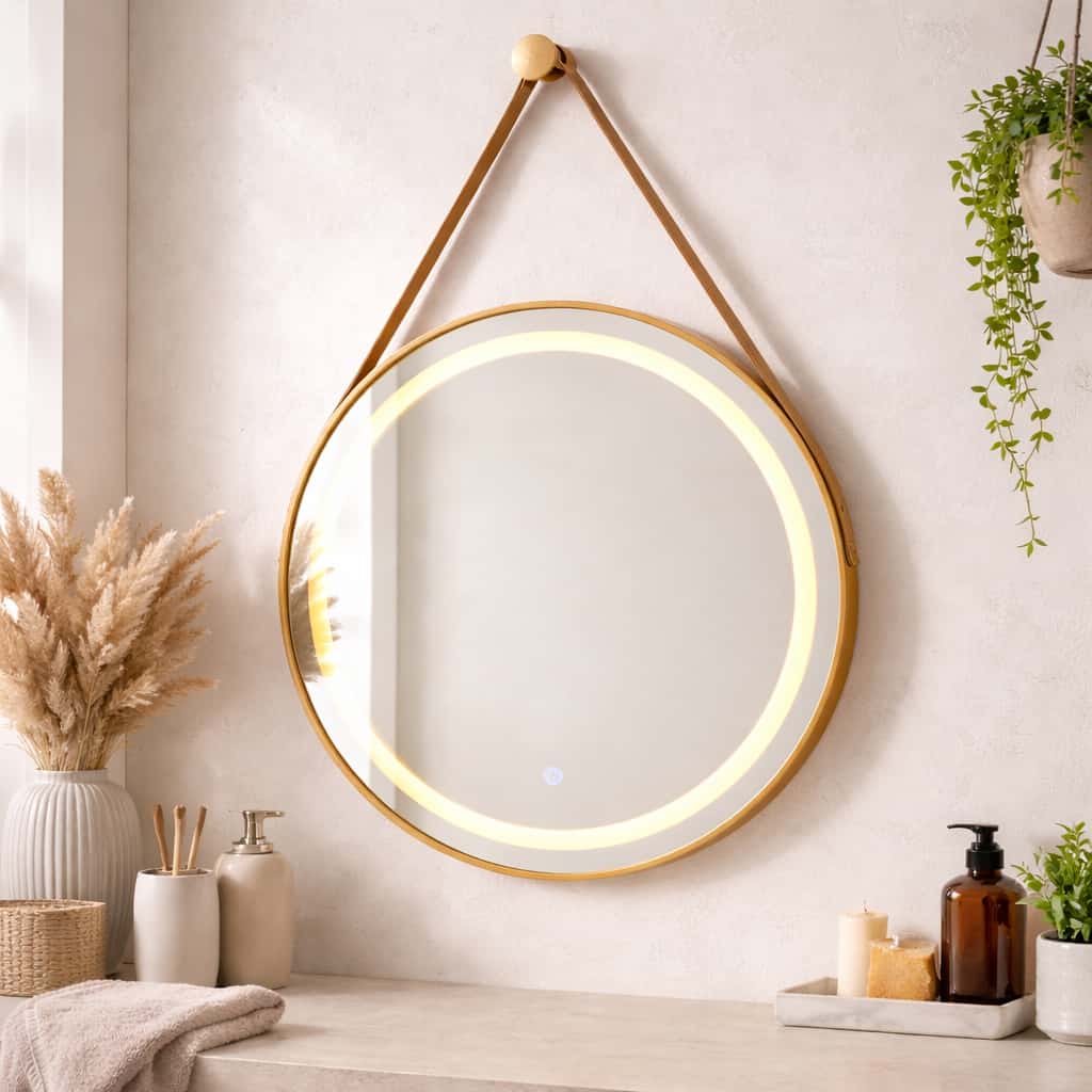 This elegant 600mm round mirror features integrated LED halo lighting, providing soft and even illumination that is ideal for grooming, skincare routines, and makeup application. The sleek gold frame adds a luxurious touch, making it a standout feature in modern interiors.
