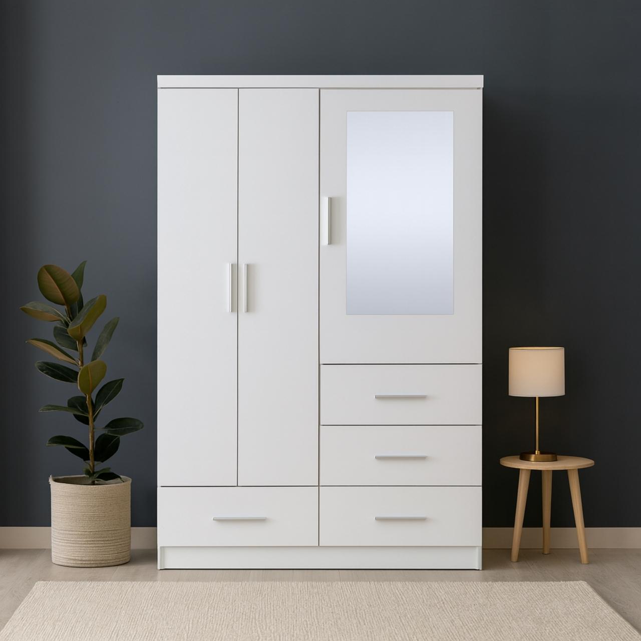 The 3 Door Wardrobe – Available in 2 Colours, combines style and functionality, featuring a sleek two-toned design with a rectangular mirror. This wooden closet includes four bottom drawers for additional storage. Its modern appearance enhances any room while providing ample space for organizing clothes and accessories.