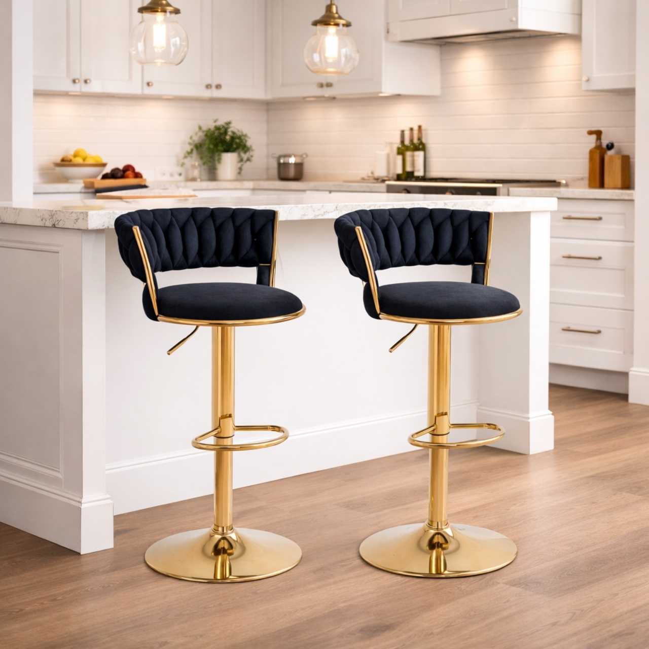 The Set of 2 Stylish Gold Frame Bar Chairs is designed to elevate kitchens, home bars, and entertainment areas with a perfect balance of luxury and practicality. With their sleek gold frame and plush upholstered seating, these bar chairs add a refined, modern touch while delivering everyday comfort. As a result, they suit both residential and commercial environments with ease.