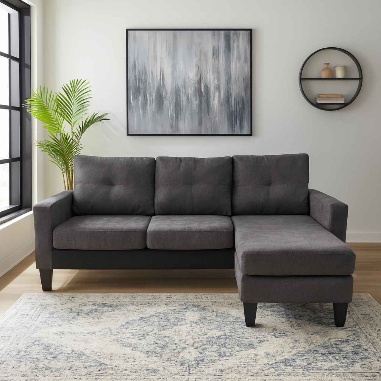 Charcoal grey upholstery provides a clean, neutral foundation that works with modern, minimal, or Scandinavian décor schemes.