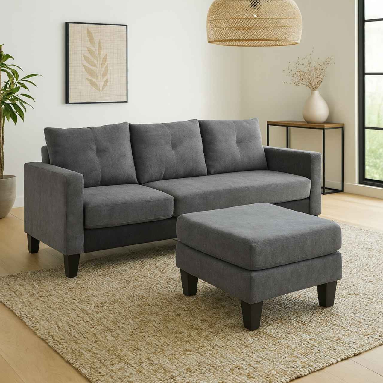 Upgrade your lounge with the Urban Lounger 3-Seater Sofa + Ottoman. Compact, stylish, and versatile — perfect for apartments and modern living spaces. Comes with a FREE Fluffy Grey Rug (150 × 200), FREE Round Coffee Table (CT380), and FREE MW1000 Bookshelf.