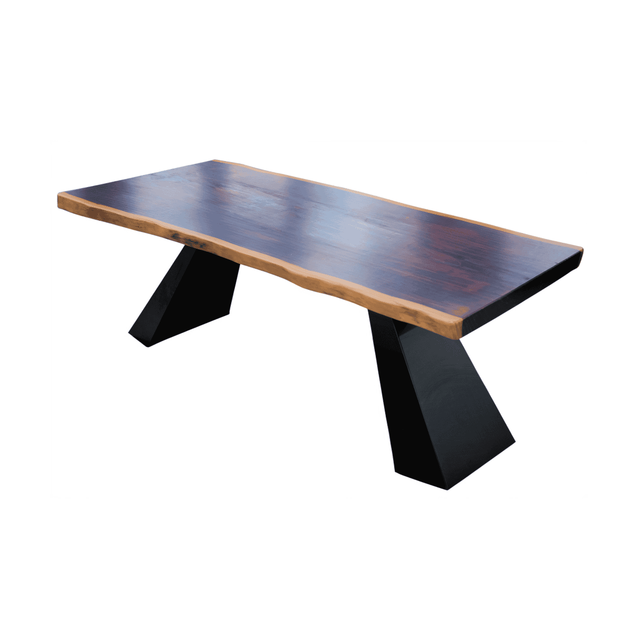 The table features a robust, modern design with natural edges on the solid wood tabletop, adding a touch of rustic charm. The contemporary legs provide stability and a sleek contrast. This combination of elements makes the table a versatile piece that seamlessly fits into both traditional and modern settings.