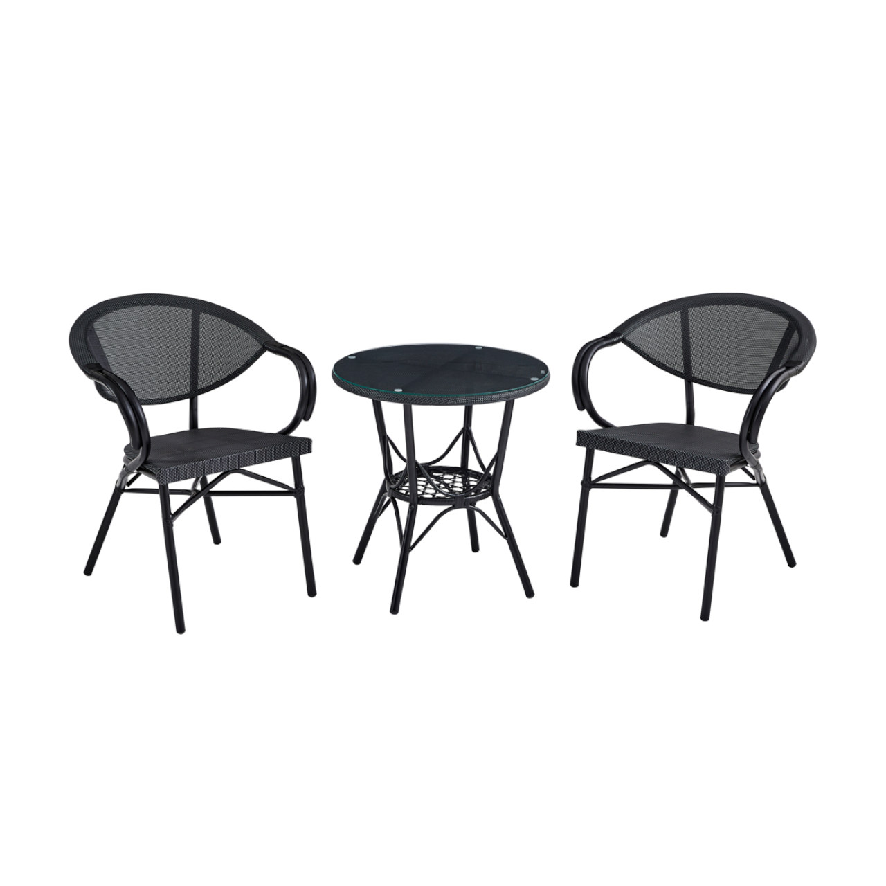 Each chair features a black metal frame with ergonomic armrests. The mesh back and seat provide excellent airflow and comfort during warm days. This design combines durability with a modern aesthetic.