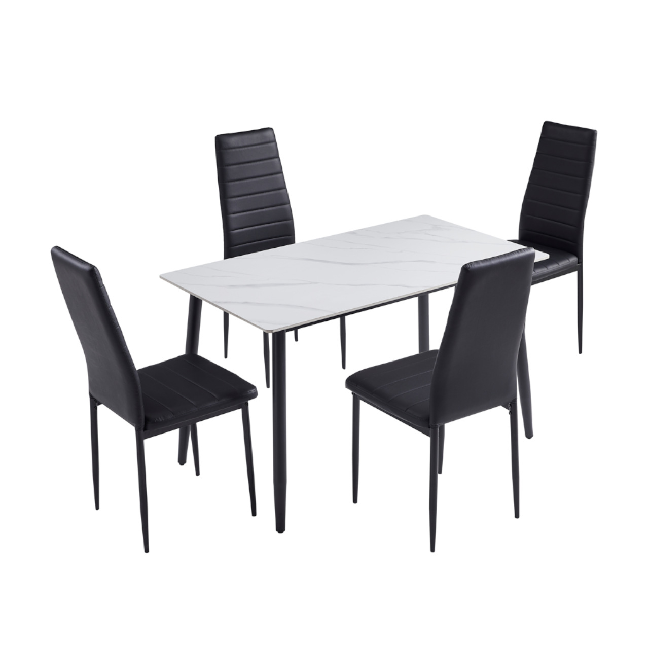 The Sleek Marble-Top 4-Seater Dining Set features a beautiful marble-effect tabletop combined with black leather upholstered chairs, creating a contemporary dining area perfect for modern homes.