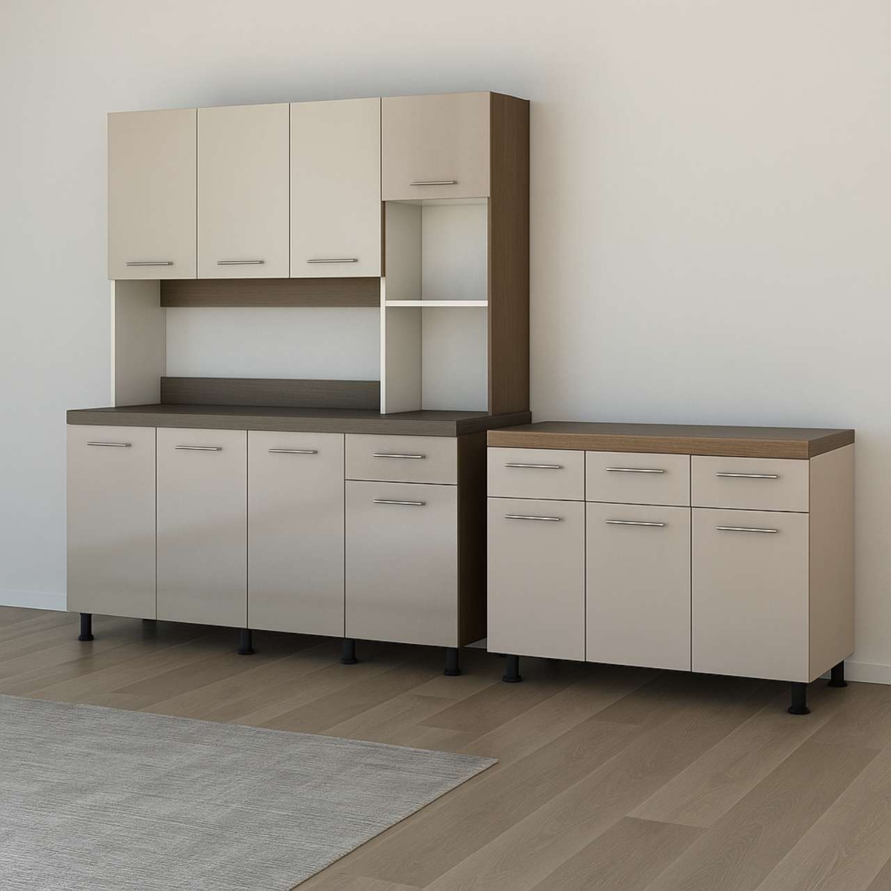 This kitchen set combines practical organization with a refined visual design. It offers generous storage, easy maintenance, and durable materials. Both units complement each other seamlessly, helping you create a coordinated kitchen that feels modern, organized, and inviting.