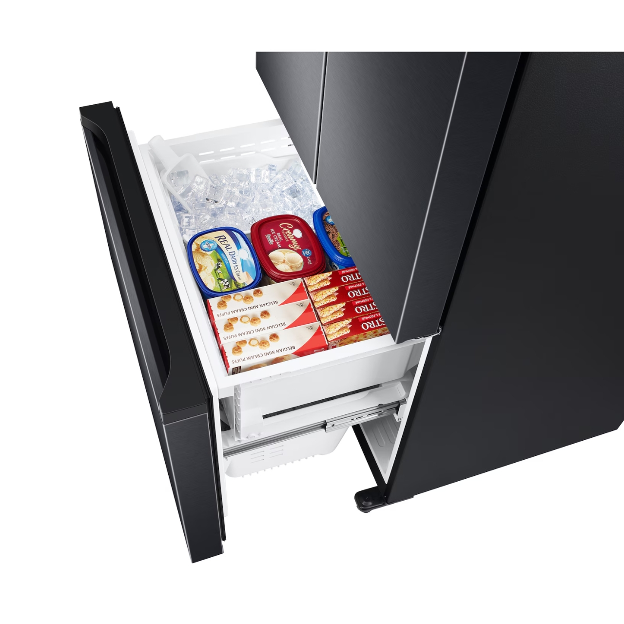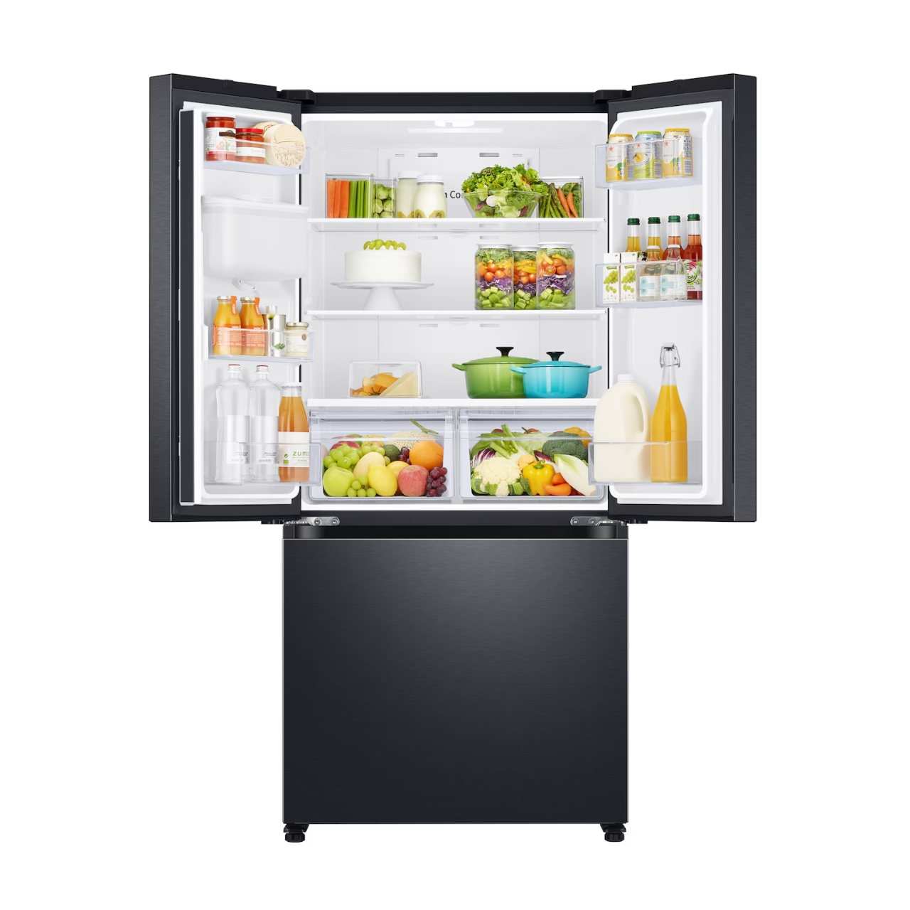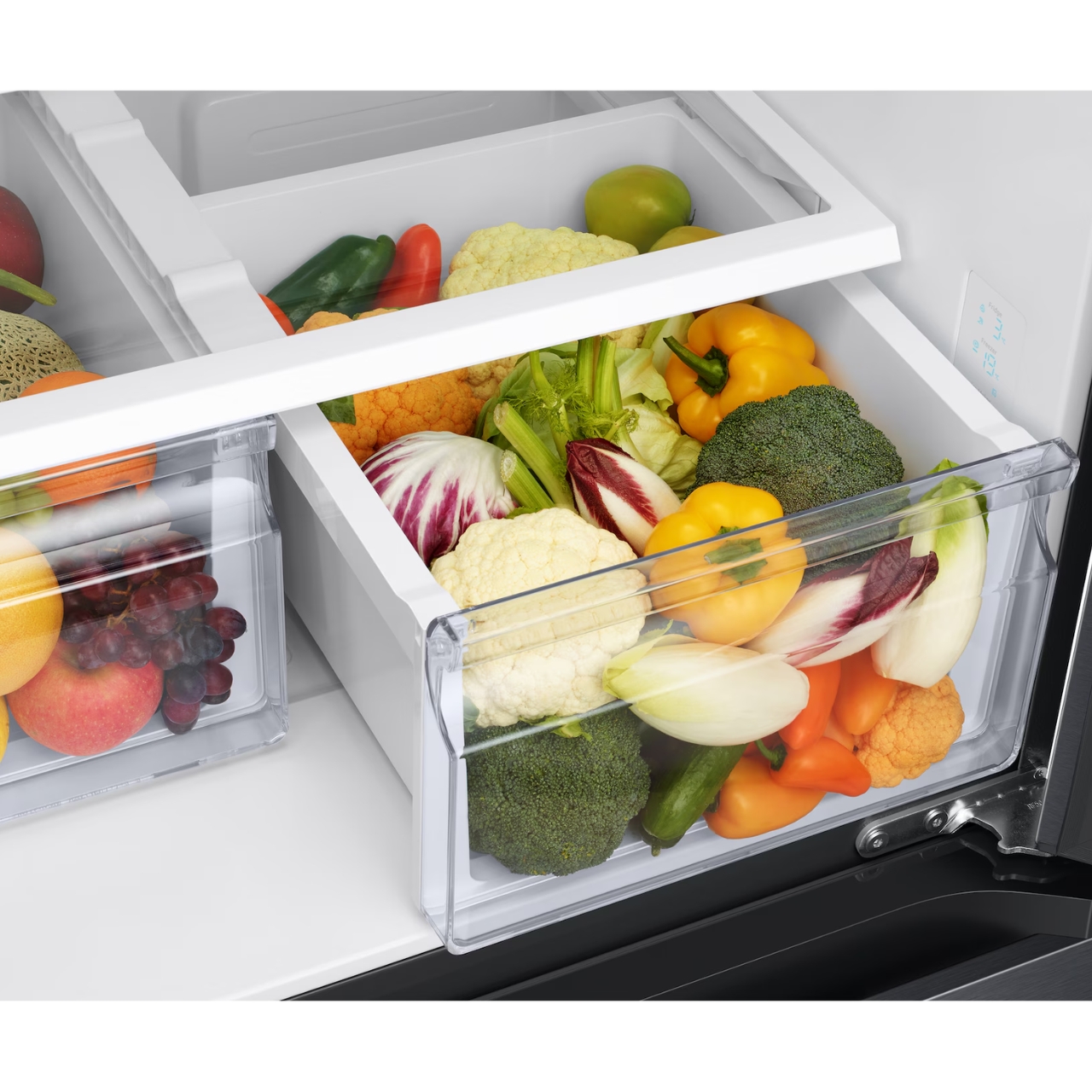 The Samsung French Door Fridge with Drawer features Twin Cooling Plus™ technology, which cools the fridge and freezer independently. This system maintains optimal humidity levels in each compartment and prevents odours from mixing. Therefore, fruits, vegetables, meats, and dairy stay fresher for longer while retaining their natural taste and texture.
