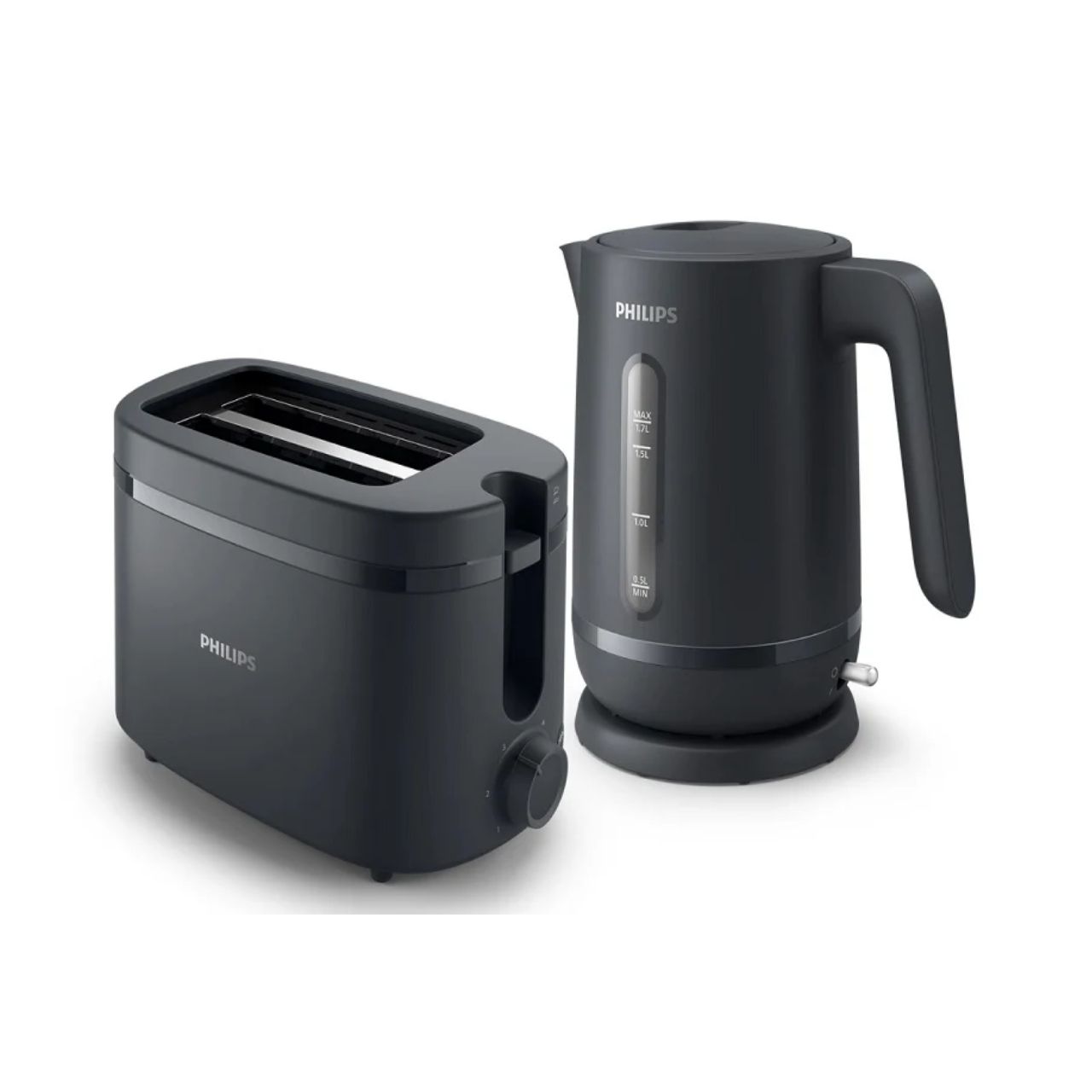 The Philips Essentials Bundle – HD2510/90 + HD9314/90 includes a 1000 Series kettle and toaster in a matching matte black design.