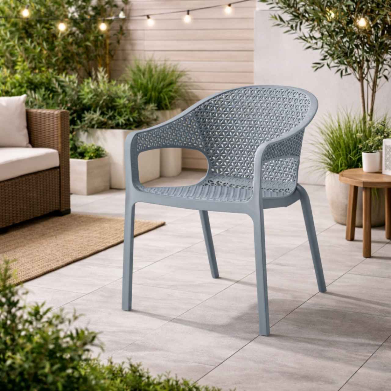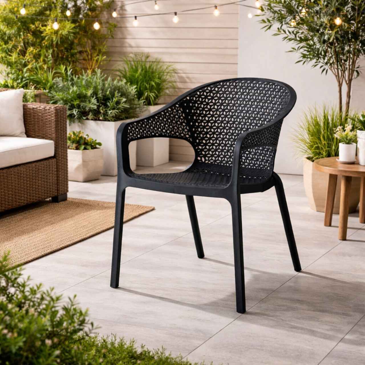 Designed for comfort, this chair includes gently curved armrests and a slightly reclined backrest that provide excellent support and encourage good posture during long periods of sitting. Its ergonomic shape ensures comfort whether you’re dining, relaxing with friends, or working outdoors. Despite its sturdy construction, the chair remains lightweight and easy to move, allowing flexibility in arranging your space.