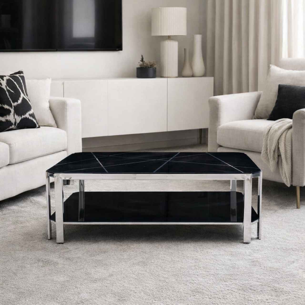 Introducing a statement piece that combines elegance and modern design. This coffee table features a distinctive black and silver glass top with a diamond pattern, paired with sleek metal legs.