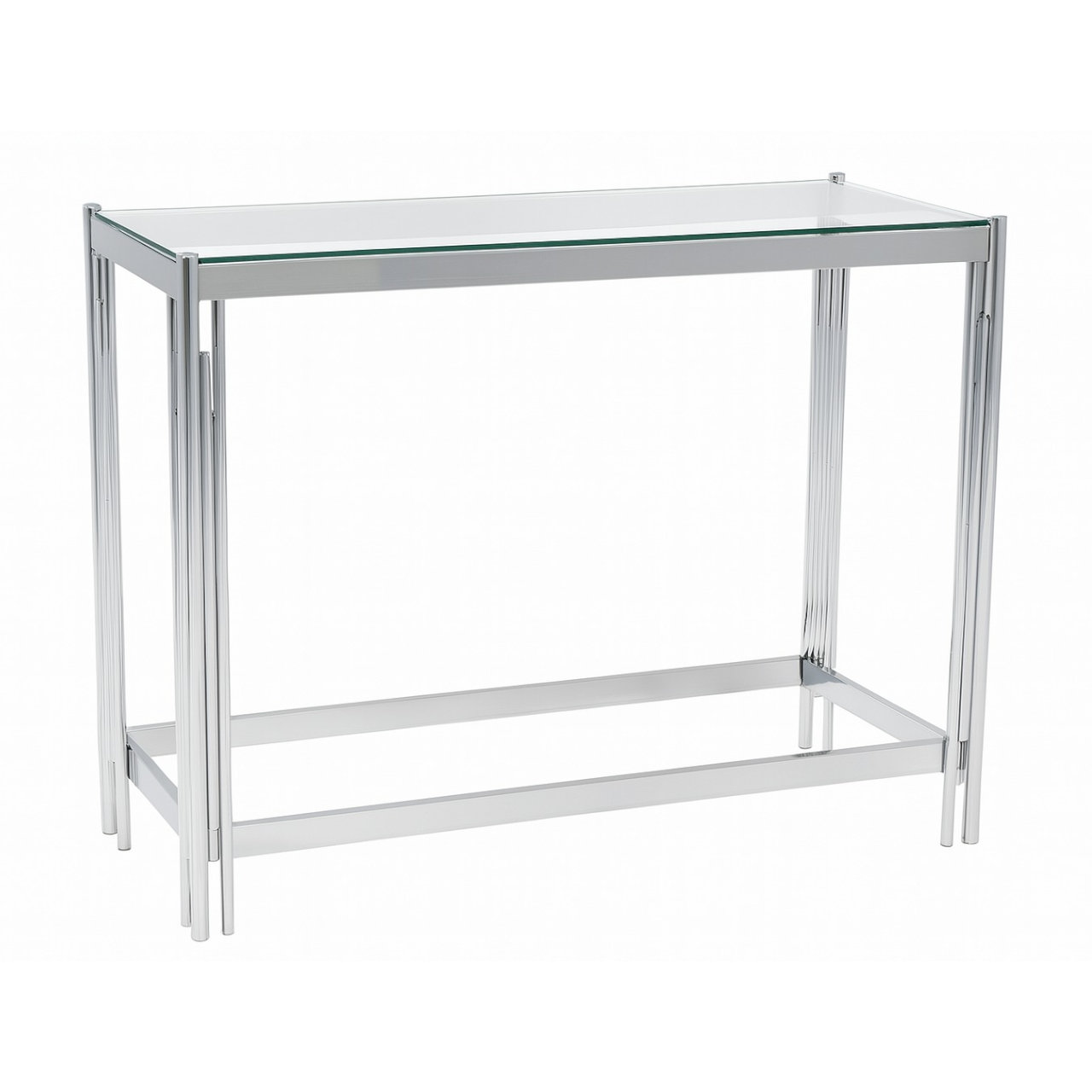 This Modern Glass & Chrome Console Table features a clear glass top and chrome frame for a sleek, minimalist look—ideal for entryways, lounges, or bedrooms.