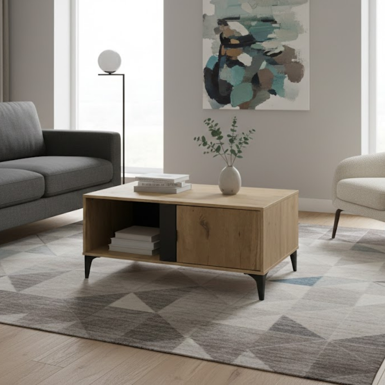 This coffee table combines style with smart storage solutions. The spacious tabletop provides ample room for décor, drinks, or everyday items. Below, an open shelf allows easy access to magazines or essentials, while the closed cabinet offers discreet storage to keep clutter out of sight. Therefore, your living area remains organised and visually balanced.