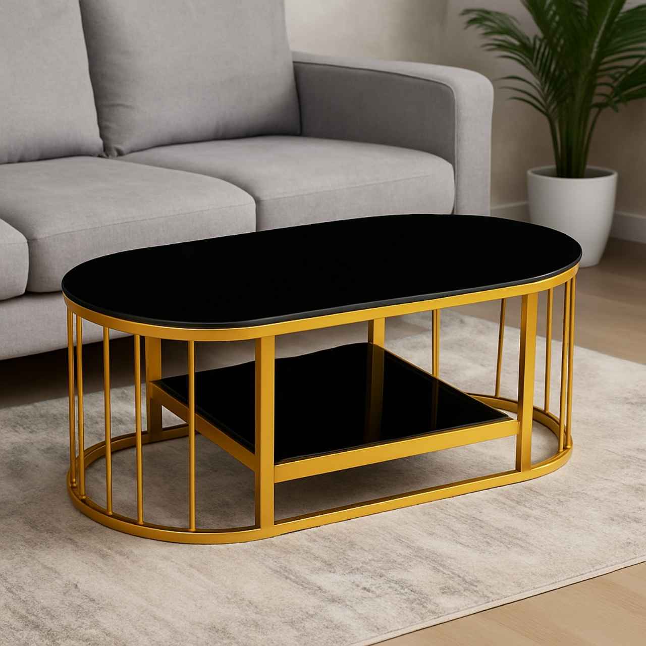 Modern oval coffee table featuring a glossy black tempered glass top, a radiant gold frame, and a practical lower shelf for storage or décor display.