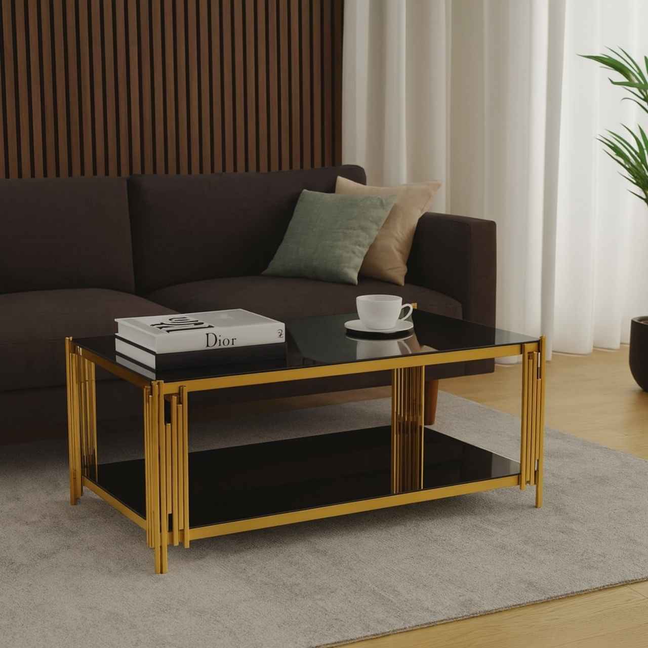 Crafted with premium black glass and a sturdy gold metal frame, the LuxeGold Glass Coffee Table is designed to withstand daily use. The durable construction ensures long-lasting performance, while the sleek surfaces are easy to wipe clean, maintaining their shine over time.