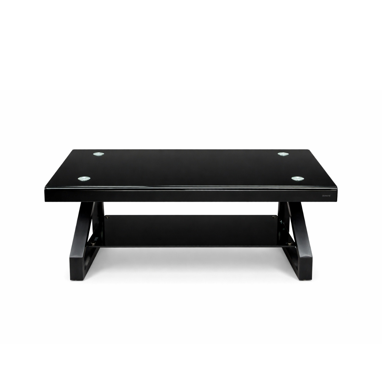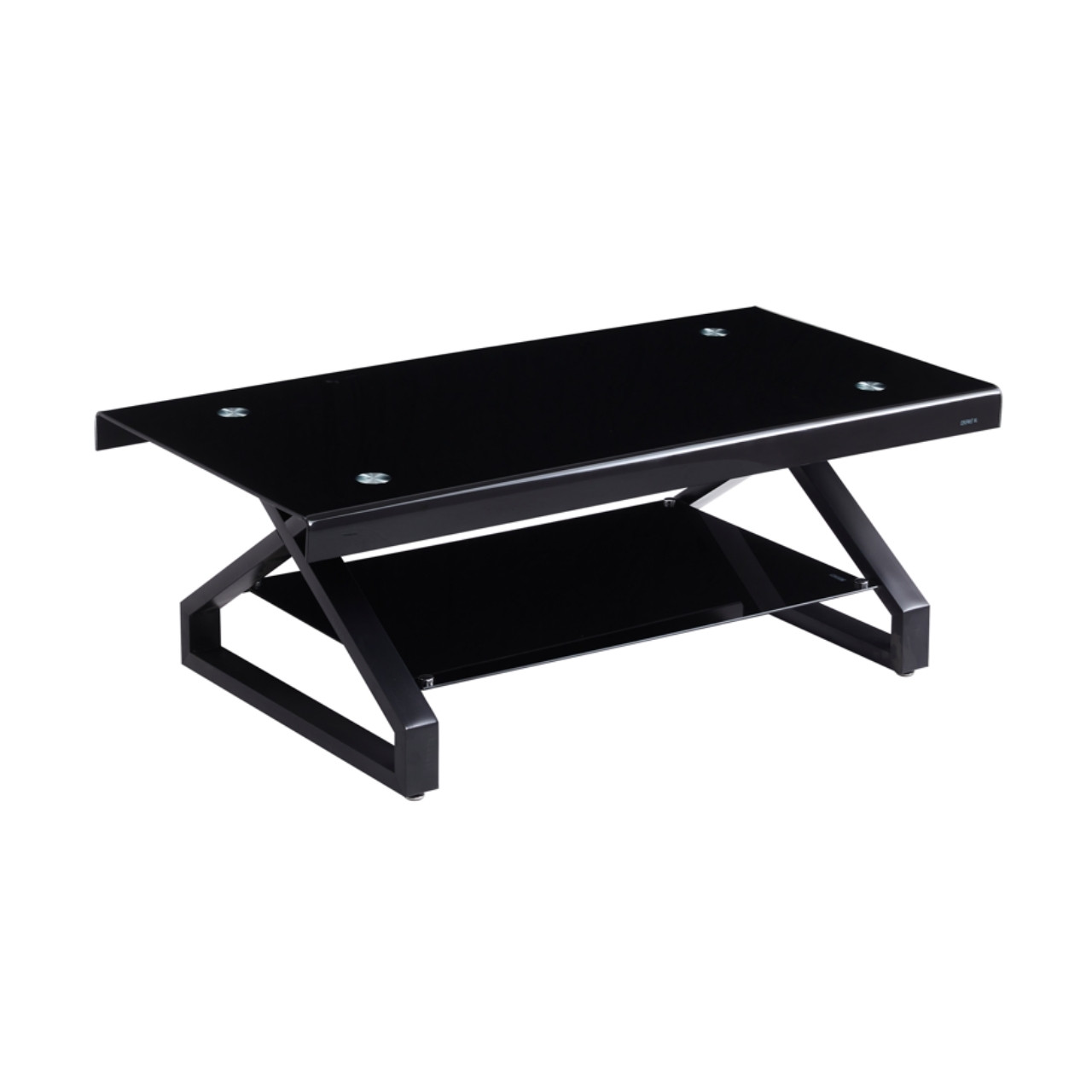 Sleek black tempered glass coffee table with bold angular frame, lower shelf storage, and a modern glossy finish.