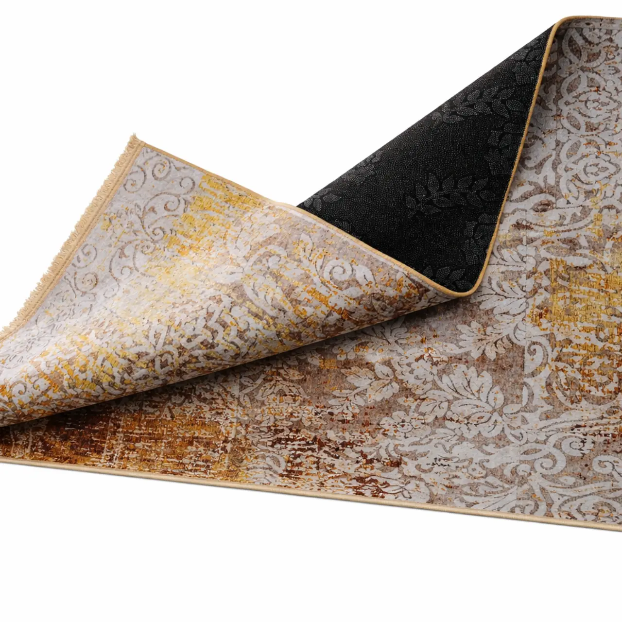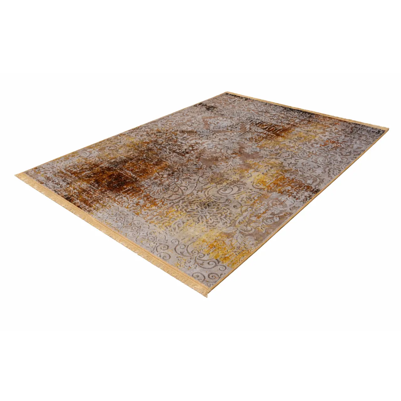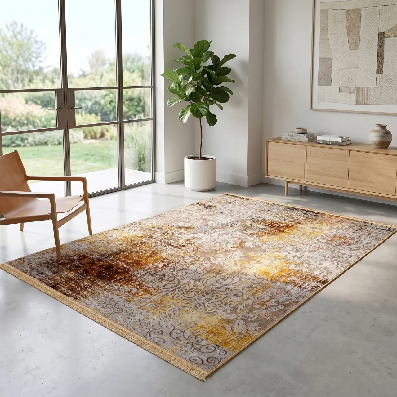 Enhance your space with this stylish carpet that blends classic ornamental detail with a modern distressed finish. Its warm neutral base is enriched with layered rust and golden tones, creating a soft yet eye-catching presence. As a result, this rug adds both warmth and character, making any room feel more refined and inviting.