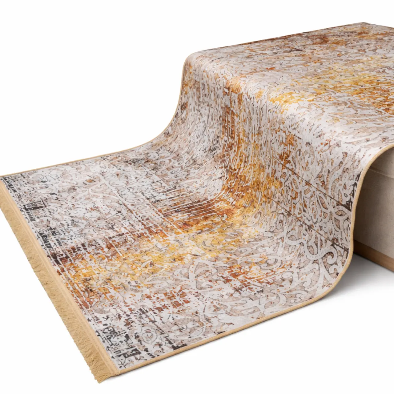 Transform your space with this modern vintage printed rug featuring a distressed floral design and warm beige, rust, and gold tones. Its layered pattern adds depth while maintaining a soft, elegant look. Additionally, it blends beautifully into both classic and contemporary interiors. Perfect for living areas, bedrooms, or offices.