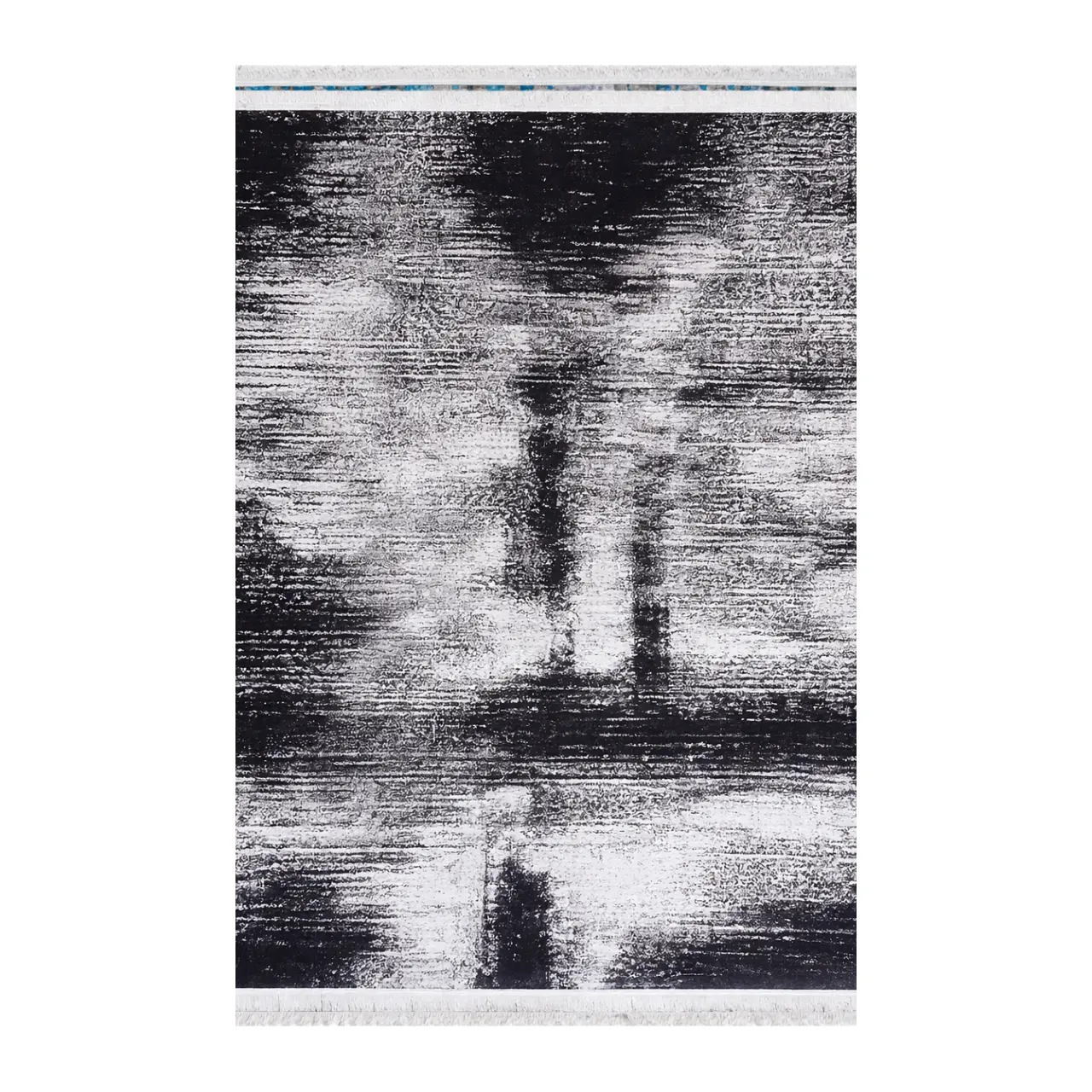 This carpet features a modern abstract pattern with layered, brushstroke-inspired markings. In addition, subtle textured detailing enhances the overall look. The design blends deep black with white and soft grey tones, creating a bold, high-contrast finish.