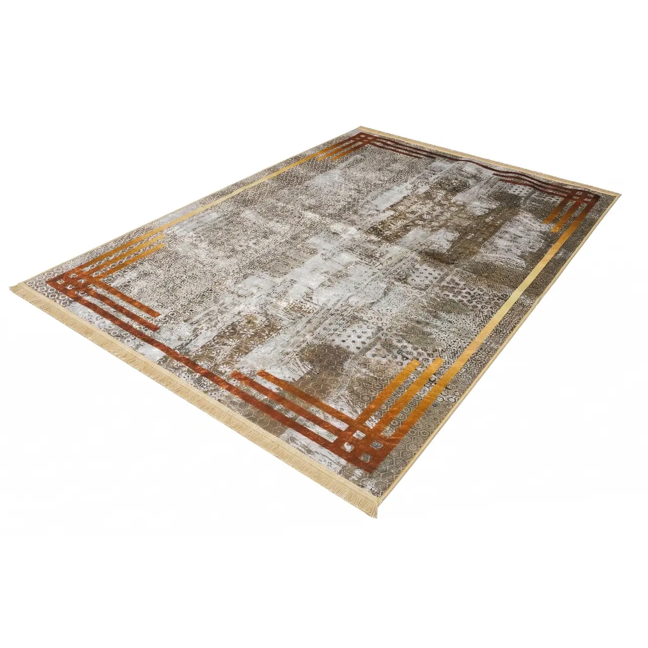 This carpet features a modern abstract patchwork-style surface with a decorative framed border that adds structure to the overall design. Additionally, the pattern combines distressed effects, subtle geometric detailing, and layered tonal variation for a sophisticated look. The mix of muted grey, taupe, beige, and soft stone shades is elevated by warm gold and rust-toned corner accents, which give the rug a more luxurious appearance. Because of this, it suits modern, contemporary, transitional, and softly styled interiors with ease.