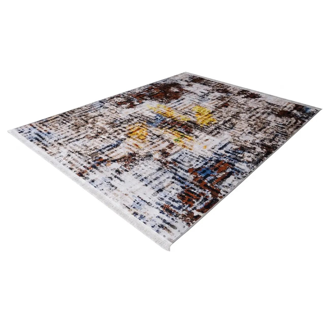 Enhance your space with this stylish carpet that brings artistic pattern, warm contrast, and modern character into the room. Its abstract printed design creates a striking visual feature instantly, while the blend of ivory, rust, brown, blue, and golden yellow tones adds depth and personality. As a result, this rug is ideal for interiors that need both softness in colour and bold decorative appeal.