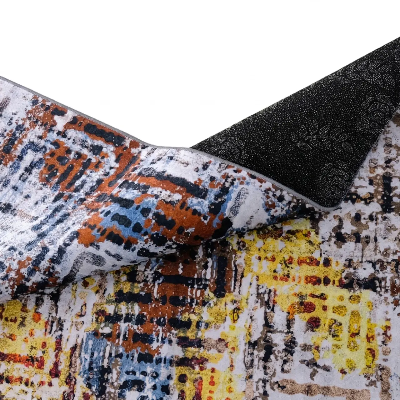 Enhance your room with this modern abstract printed rug featuring an ivory base with rust, blue, brown, and golden yellow accents. Its artistic distressed pattern adds depth, colour, and visual texture instantly. Additionally, it suits living rooms, bedrooms, offices, and stylish open spaces beautifully. Because of its versatile look, this rug pairs well with both neutral furniture and bold décor for a polished, contemporary finish.