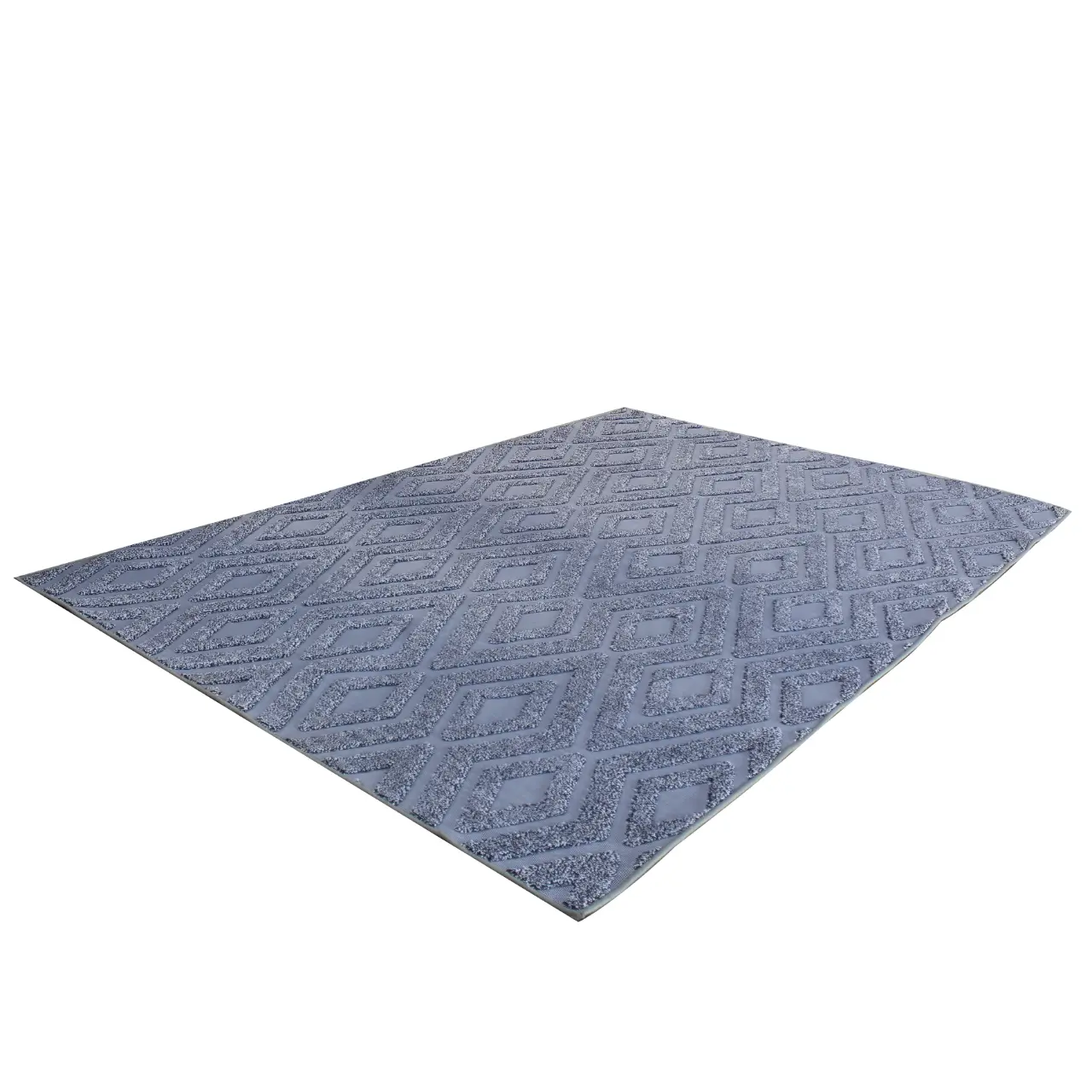 The surface showcases a raised, tufted texture that enhances the geometric pattern. Moreover, the contrast between the textured diamonds and the smoother base creates a visually rich effect. Because of this, the carpet appears soft, inviting, and refined while maintaining a clean finish.