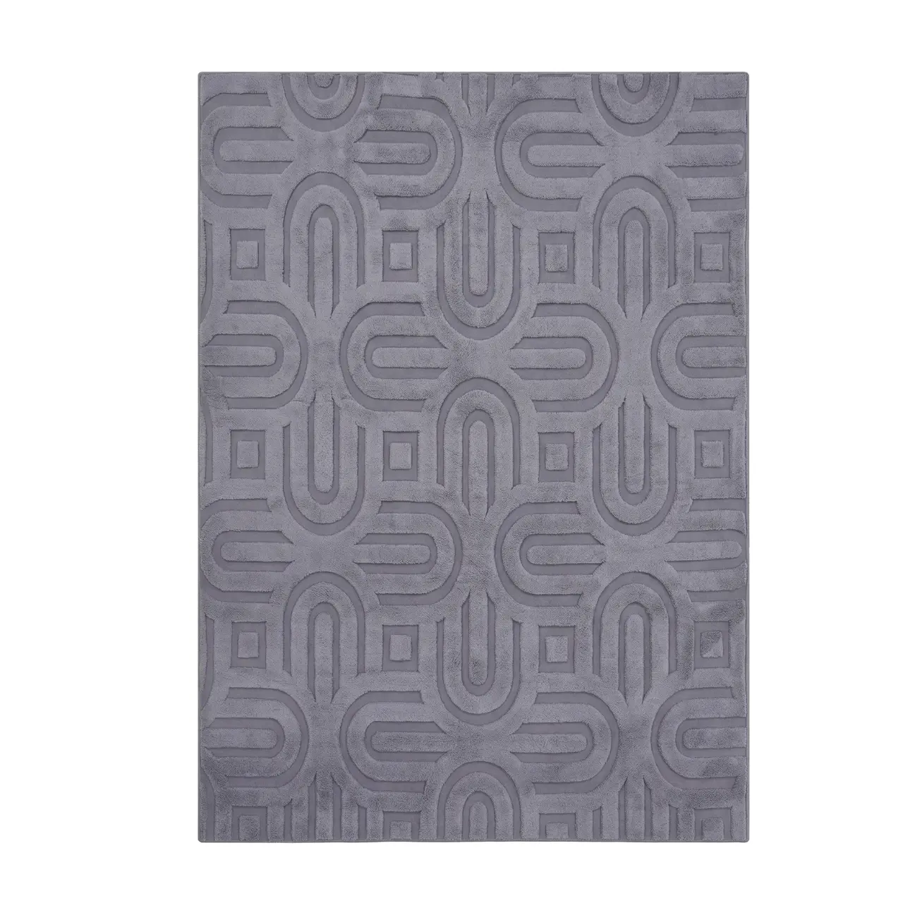 A modern grey carpet featuring a sculpted geometric pattern with a raised textured finish. Perfect for adding depth and style to contemporary spaces.