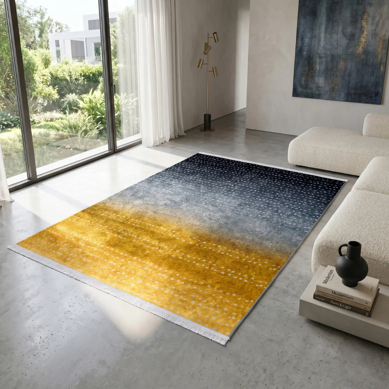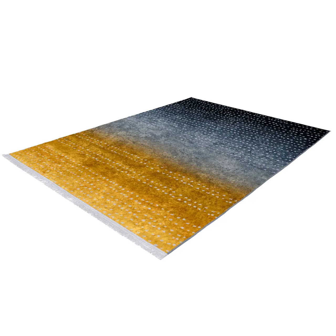 Bring modern style into your home with this abstract printed rug in mustard, grey, and deep blue tones. Its ombre-inspired design and dotted pattern detail create a bold yet elegant focal point. Additionally, the soft visual finish helps the room feel warm and complete. Ideal for contemporary interiors, this rug suits lounges, bedrooms, and offices beautifully.