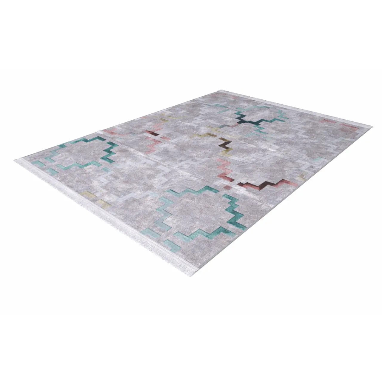 This carpet features a geometric pattern made up of layered diamond-like shapes with stepped edges. The design appears structured yet softened by its faded, textured background. Additionally, the colour palette combines light grey tones with accents of teal, coral, mustard, and deep charcoal. Because of this, the rug achieves a balanced look that feels modern, slightly abstract, and visually interesting. It pairs well with contemporary, minimalist, and Scandinavian-inspired interiors.