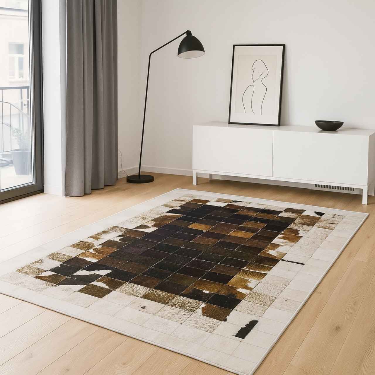 The Mosaic Printed Rug features an intricate pattern of varying brown and cream tones arranged in a patchwork style. This eye-catching design mimics the texture and depth of leather tiles, offering a warm, rustic charm to any room. The neutral color palette makes it versatile and suitable for various décor styles, from contemporary to classic.