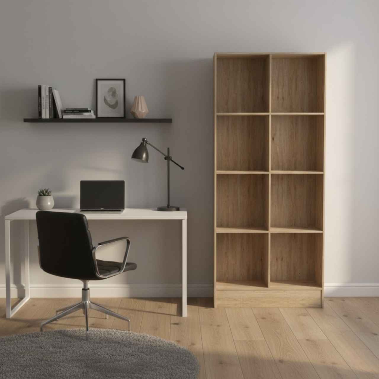 The Bookshelf – Natural Oak features eight evenly divided compartments arranged in a 4-tier vertical layout. With its tall structure and wide surface, it offers ample space for organizing books, files, décor, or storage bins. It’s the perfect solution for maintaining order in high-traffic or multifunctional areas like home offices, lounges, and workspaces.
