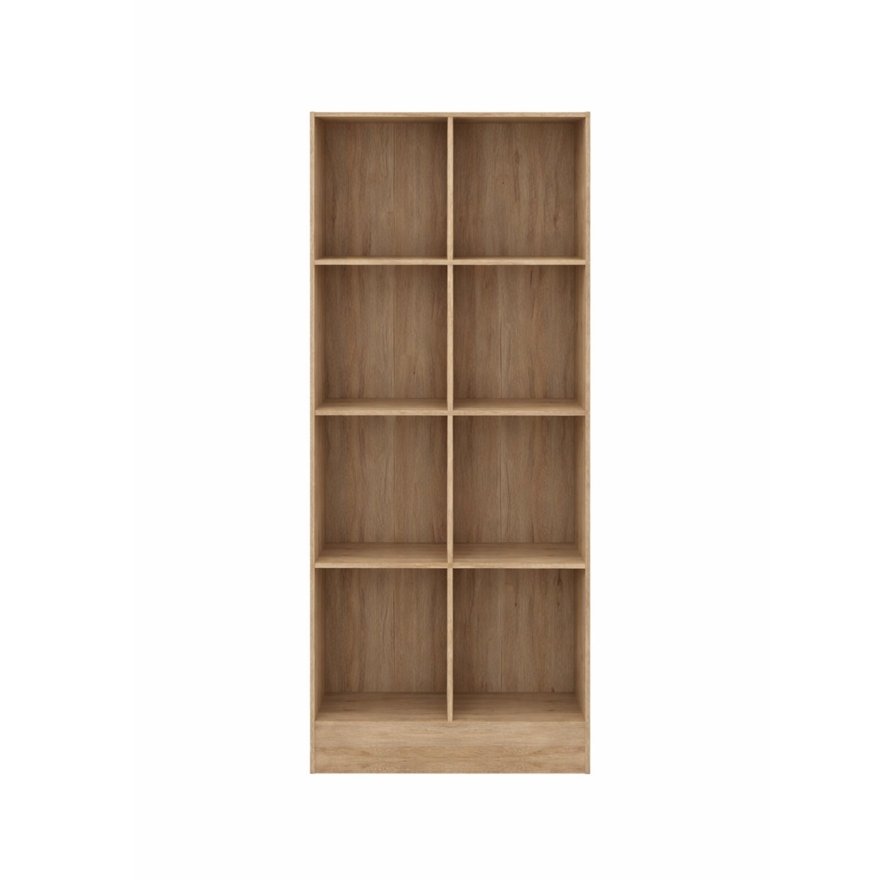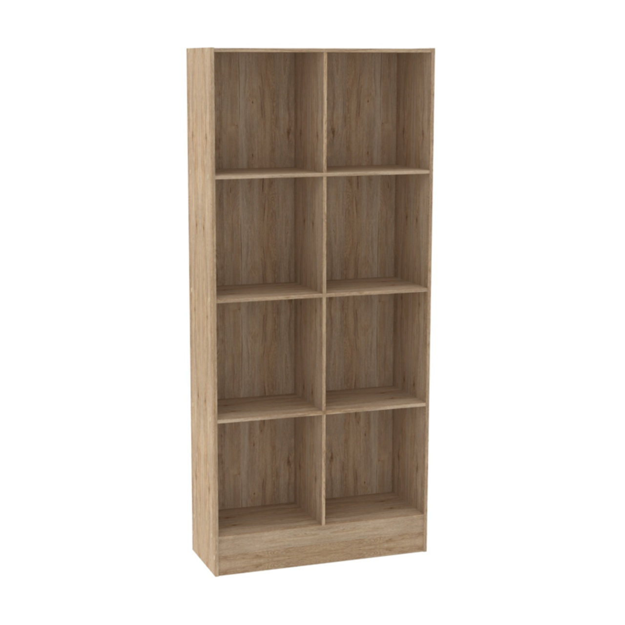 The MW8000 Bookshelf offers eight spacious compartments in a natural oak finish. Measuring 300mm x 800mm x 1800mm and weighing 28.66kg, it provides modern, vertical storage for books, décor, and bins in home or office environments.
