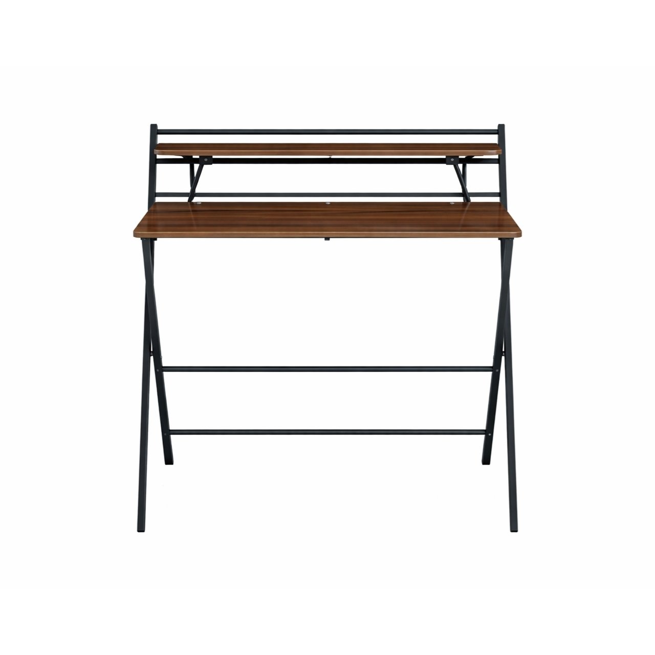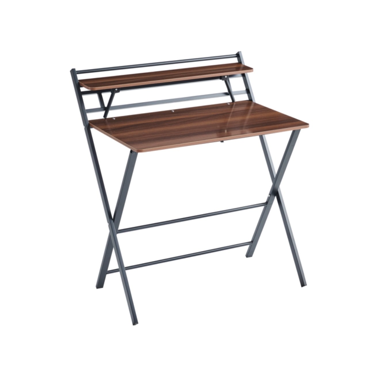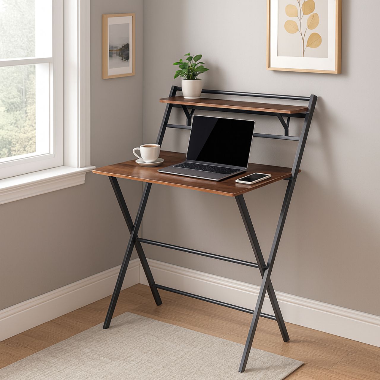 The MW9620 folding desk includes a durable wood-look tabletop that provides enough space for laptops, books, and stationery. Above the main surface, a slim shelf adds storage for notebooks, small accessories, or decorative pieces. This design keeps your workspace tidy and organized.