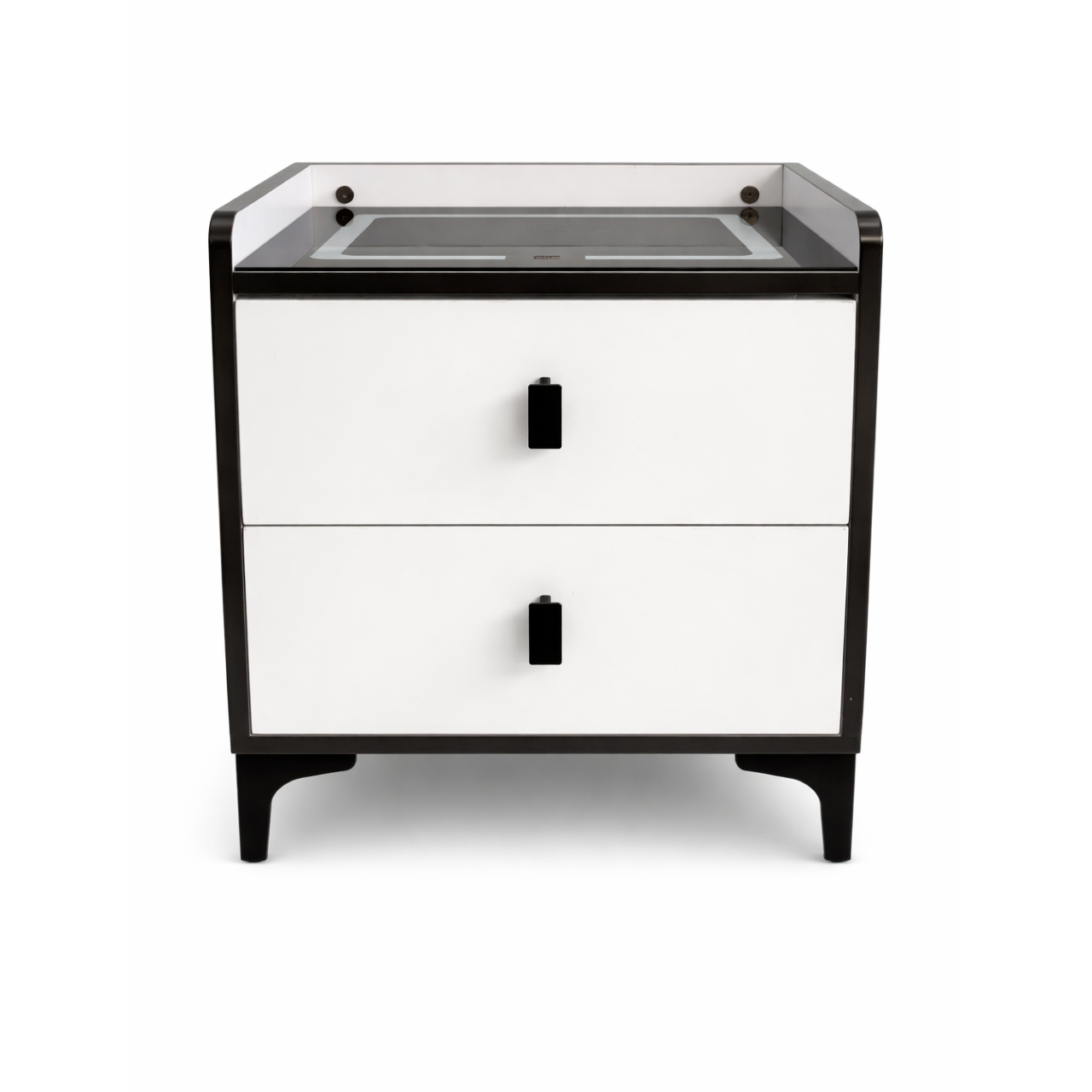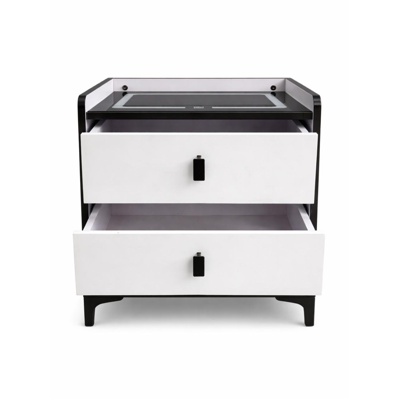The nightstand includes two spacious drawers, perfect for storing books, glasses, and personal items. The combination of black and white finishes adds a contemporary touch to any bedroom décor.