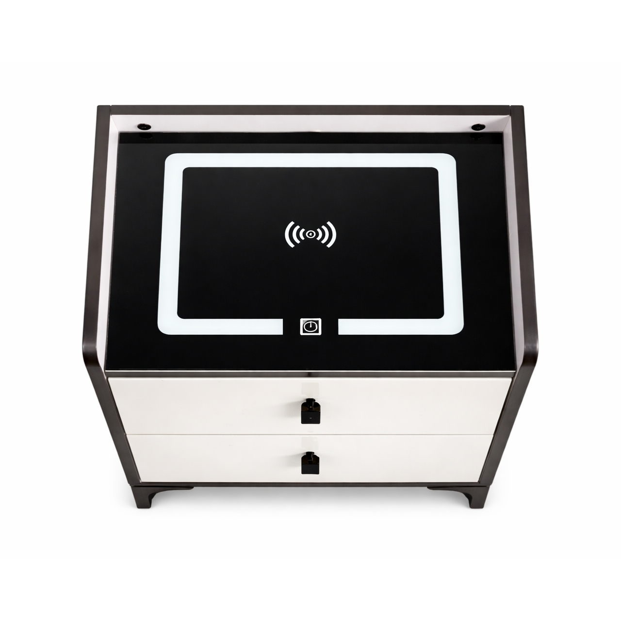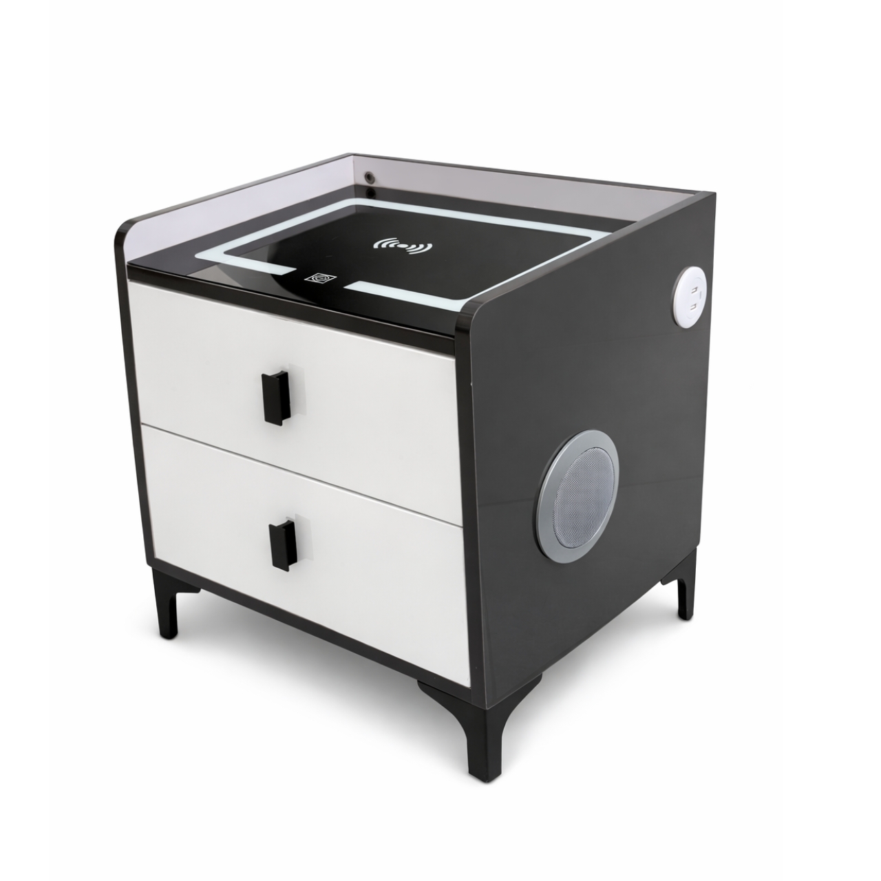 This nightstand with Bluetooth speaker, LED light, and wireless charger offers smart bedside convenience with modern style. Featuring USB charging ports and two drawers, it combines storage, technology, and sleek black and white design.