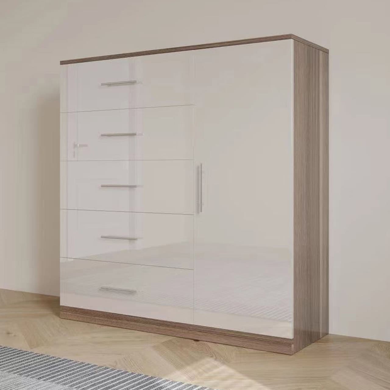This cabinet is more than just bedroom storage — it works well as a stylish organiser in living spaces, hallways, or home offices. Its neutral finishes (White, Cappuccino, Grey) make it easy to pair with other furniture such as the 3 Door High Gloss Wardrobe and 4 Door High Gloss Wardrobe for a cohesive bedroom set.