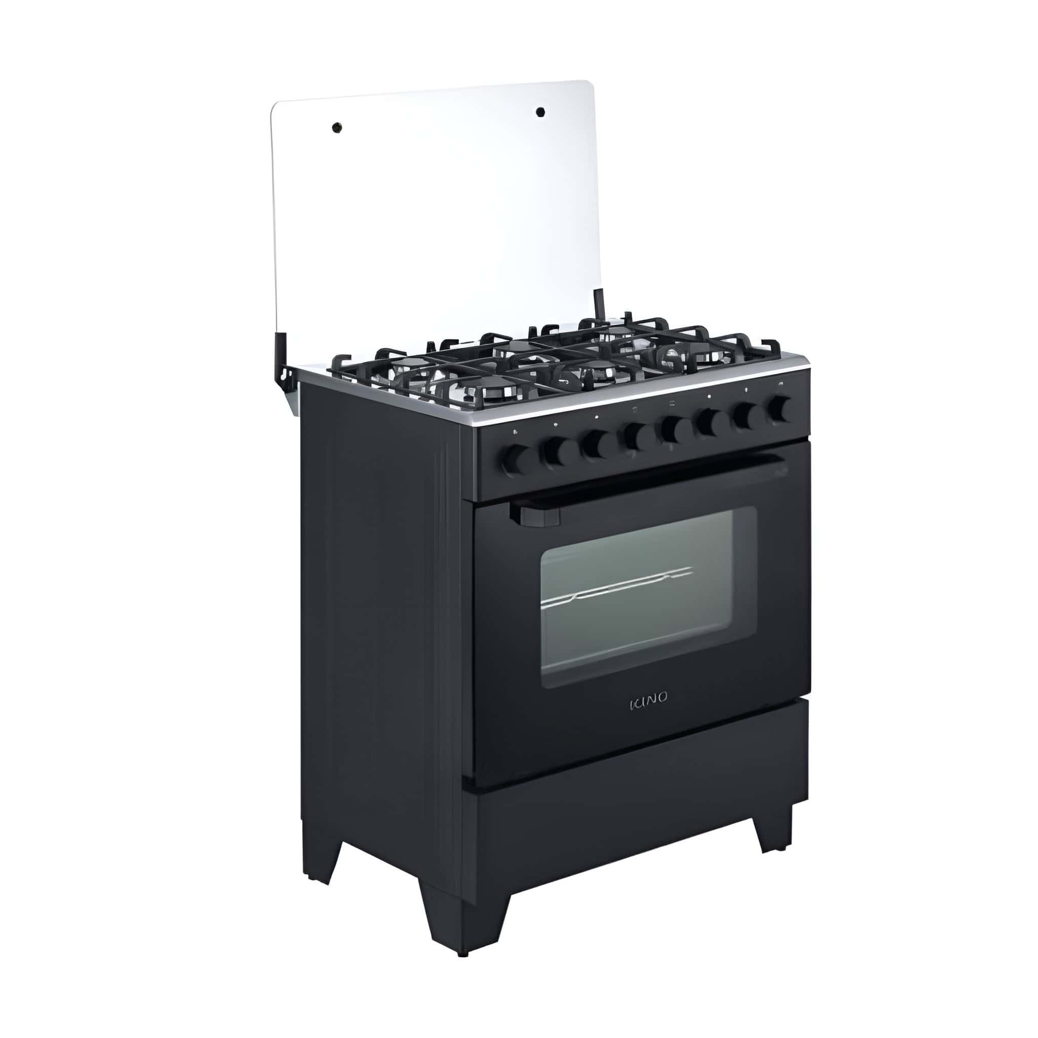 The King KGP760BFFD is a 76cm full gas stove with six burners, a gas oven with grill, auto ignition, and flame failure safety. It features a matt black body, stainless steel top, cast iron grids, glass lid, mechanical timer, and removable feet for easy use and cleaning.