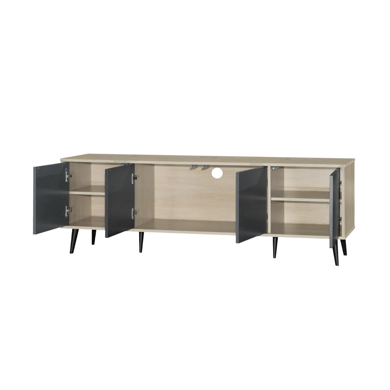 A stylish, modern TV stand with 4 doors and hidden shelving in an Oak Ash and Dark Grey finish. Sleek design for organized entertainment setups.